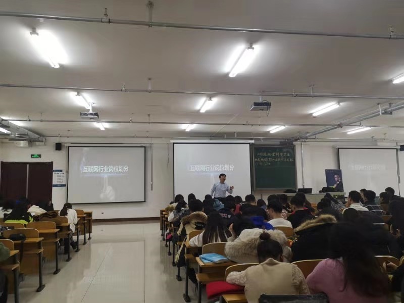 讲座伊始,主讲人王焱老师通过对“历届高校毕业生人数”、“2018年高校应届毕业生起薪”、“2018年应届毕业生专业对口率”等数据的分析,总结出近年来应届毕业生就业情况,同时针对这些问题向同学们提出建议,希望同学们能够提高自身素质及实力,来应对激烈的市场竞争。接着,他以“不同年龄段第一份工作平均在职时间”的调查结果明确指出当今时代各行各业的人才处于饱和状态,出现毕业生专业不对口的现象。紧接着,王焱老师将“互联网+”新时期互联网行业的发展趋势与实际工作相结合进行全方位的讲解,让同学们对互联网行业有了更深一步的认识。同时,对互联网行业岗位进行简单的划分,同学们初步了解到互联网行业各个岗位的基本情况。现场气氛热烈,同学们获益匪浅。