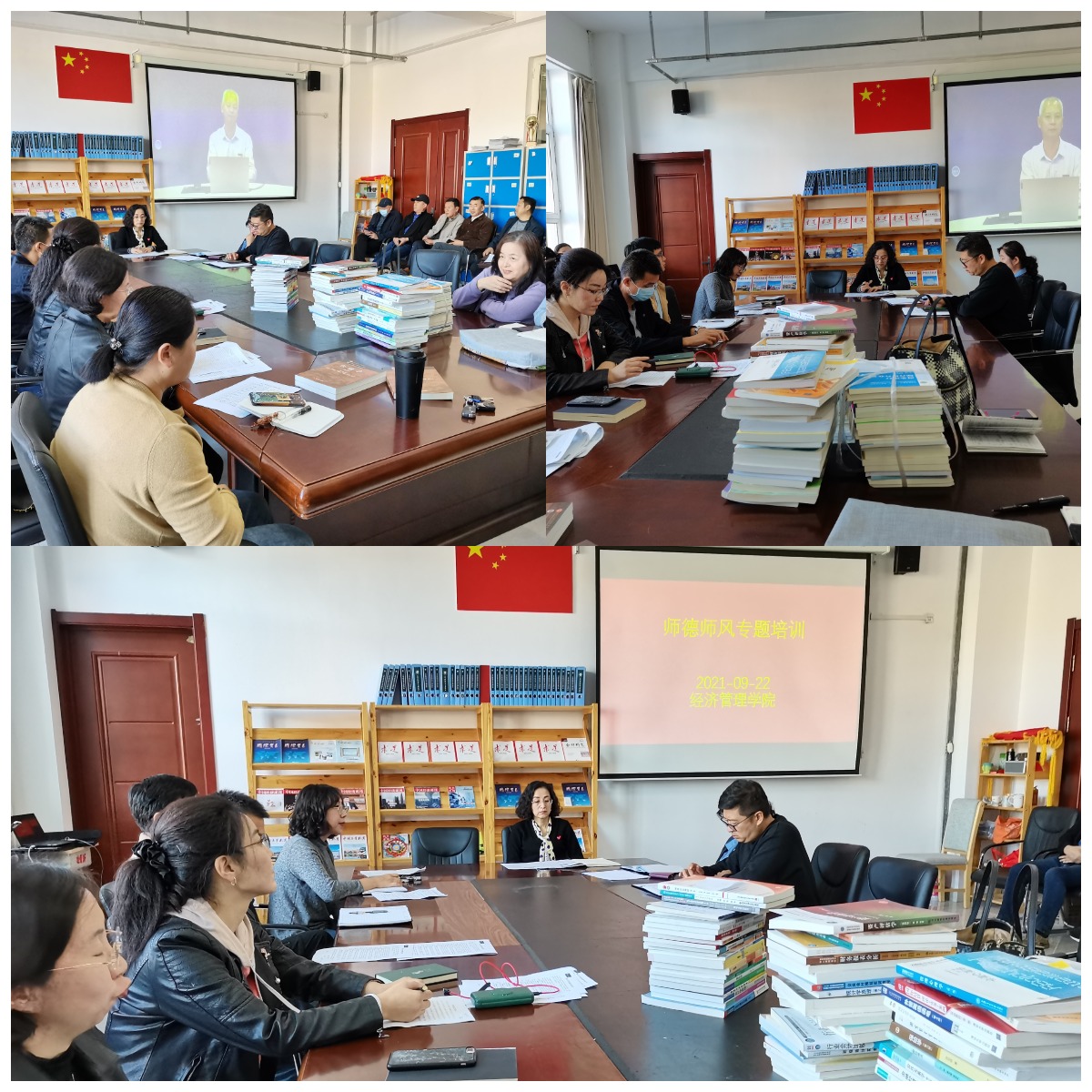 教育大会上,李雪峰院长首先传达了学校有关师德师风建设工作通知精神及师德师风建设年相关内容,并带领学院全体教职工一起学习了《高等学校教师职业道德规范》、 《新时代高校教师职业行为十项准则》、 呼伦贝尔学院师德师风承诺书等文件精神,就承诺书内容向全院教师进行了解读。