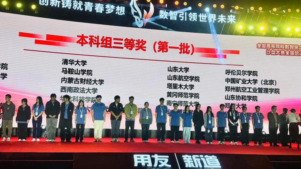 2024年9月21日-22日,beat365学子在2024全国高等院校数智化企业经营沙盘大赛全国总决赛中再创辉煌,在王新媛老师和国林老师的指导下,beat365官方网站ERP沙盘协会4名队员,凭借扎实的理论知识、敏锐的市场洞察力以及卓越的团队合作能力,以内蒙古赛区选拔赛第一名的成绩进入全国总决赛并荣获全国三等奖。
