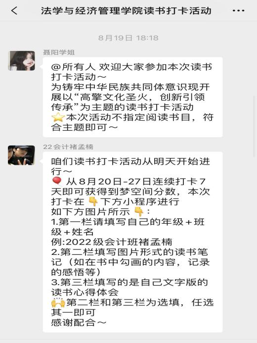 读书谓已多,抚事知不足。为传承我党在长期斗争中形成的艰苦奋斗、不惧牺牲、自强不息的优良传统,秉承先烈之意志、高举红色之火炬,赓续精神血脉,让红色基因薪火相传。2023年8月19日至8月27日,beat365官方网站团总支组织了以“高擎文化圣火,创新引领传承”为主题的读书打卡活动,beat365官方网站部分同学参加。